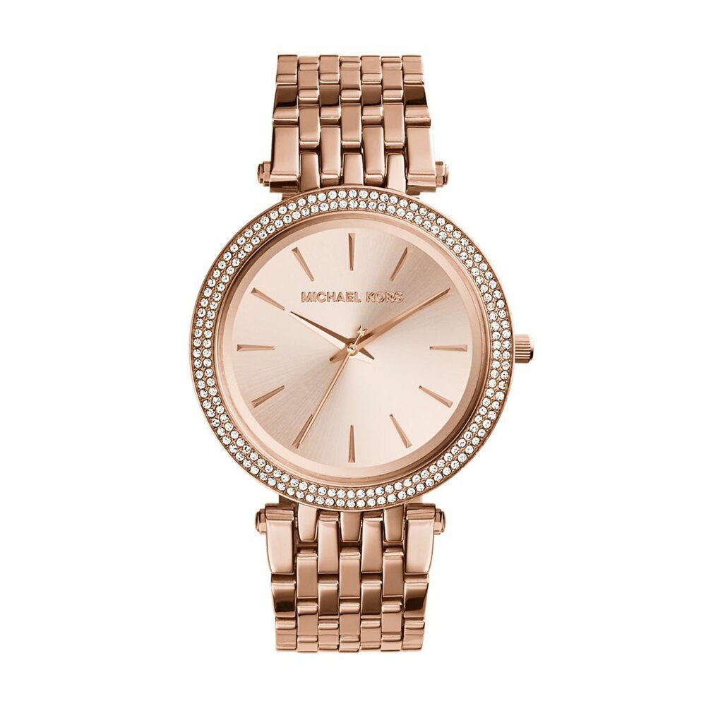 This Michael Kors timepiece features a classic dial set on a sparkling pavé case. A plated steel bracelet completes the look.